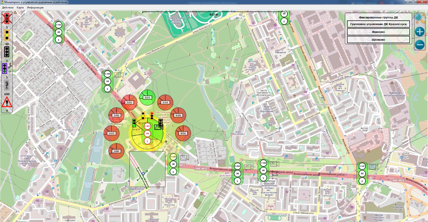 Отслеживание перемещений периферийного оборудования светофорных объектов по различным географическим объектам на основе данных, получаемых от подсистемы геолокации;